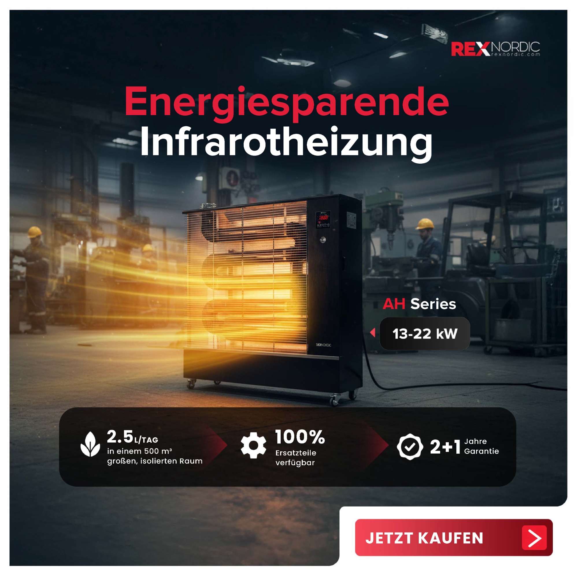 Rex Nordic Heizgeräte sind für Leistung, Sicherheit und Mobilität entwickelt. Ob Sie ein Lager, einen Arbeitsplatz oder eine temporäre Struktur heizen, alle unsere Modelle teilen wichtige Vorteile: